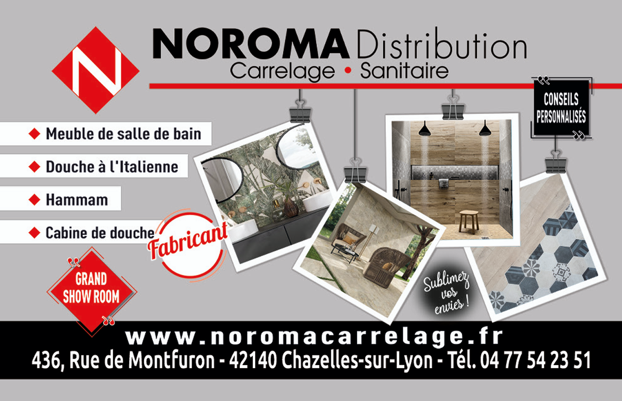 Noroma Distribution est une entreprise familiale située à Chazelles-sur-Lyon dans le Loire (42) et spécialisée dans la vente de carrelage (intérieur, extérieur et faïence). Ainsi que les sanitaires, meubles de salle de bain, robinetterie, paroi de douche, ... Nous proposons également un large choix d'outillage nécessaire à la pose du carrelage.